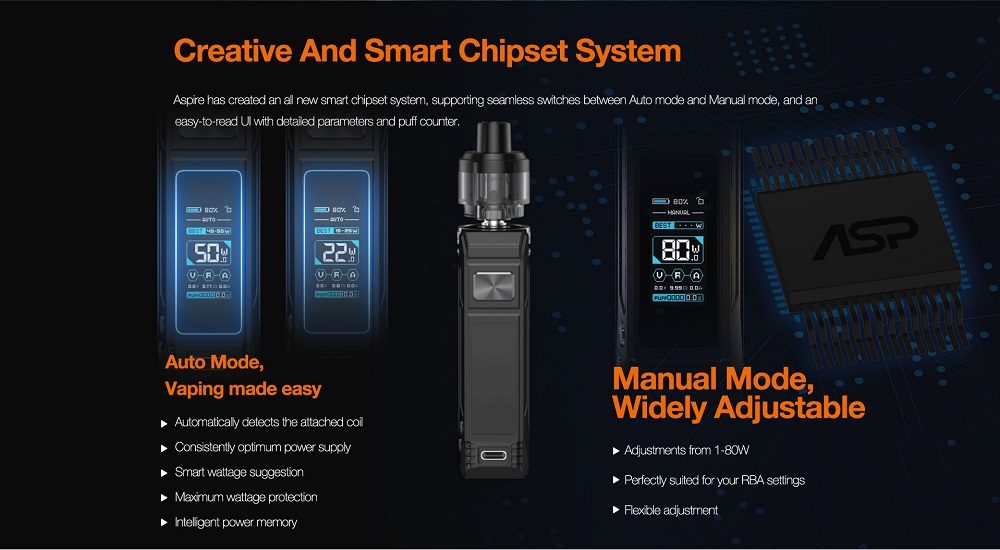 Aspire has created an all new smart chipset system, supporting seamless switches between Auto mode and Manual mode, and an easy-to-read UI with detailed parameters and puff counter.